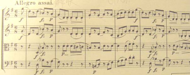 第一首詩之意境的表情非常纖細溫婉,可以說是『文勝質』的代表;而第二首詩的文字質樸無華,卻又情趣盈溢,更是標準的天才型不必用太多精細修詞的創作,是標準的『質勝文』代表。 同一個人的兩個作品能如此對比,令我想到舒伯特與布拉姆斯的對比。 舒伯特的作品有一種樸實,你常會在一些後期作品的最後一個樂章發現,他會在輪旋曲式的『A-B-A-C-A-B-A』型式中,在後半段C-A-B中多加了一段非常即興的旋律X而成為C-A-X-B,例如第十五號弦樂四重奏第四樂章的主旋律A是:
