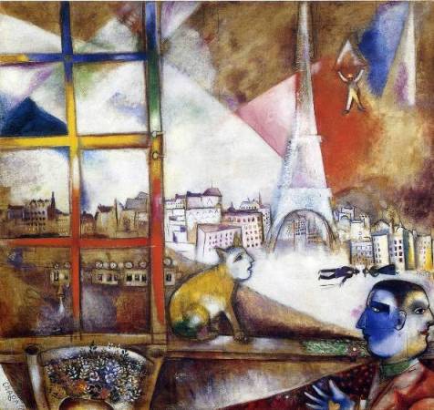 如果跟早期的「葬禮」、「婚禮」兩張比較的話,1913年的「窗外巴黎」這一張畫的顏色顯得非常的鮮豔。夏卡爾到巴黎的時候,正是立體主義最風行的時候,所以可以看得出來他受立體主義的影響。但是夏卡爾很有意思,你如果看他的自傳,或者是他的採訪,會發現他並不承認自己受立體主義的影響,他總是說「沒有,我都是用我的直覺,我在用我的筆在寫詩,我不覺得這個我受立體主義的影響」。他在自傳裡面說:「管他的立體主義三角型,讓那個三角型去死吧。」但如果看他的畫作,卻可以看到他剛開始繪畫時,受所謂分析派的立體主義影響很深。「窗外巴黎」中也可以看到綜合派的立體主義影響,就是把很多的元素打散,放在一個畫面上。從畫面裡可以看到夏卡爾天馬行空的特色,中間有貓,右上方有個人在跳降落傘,但是畫中的火車是倒過來的,有兩個人飄在空中不曉得在幹嘛,右下角是一個兩面的人;有人說這或許是夏卡爾一邊望向他的故鄉,一邊望向他的巴黎?的確很有可能,雖然他離開他的故鄉的時候說「我迫不急待的離開這裡。」但是故鄉從來沒有離開他的腦子裡,故鄉一直是他的畫作裡一個非常非常重要的元素。