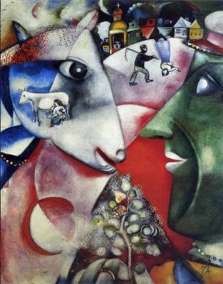 在著名的「鄉村與我」(1911年)中,立體主義的影響更明顯,除了受立體主義的影響之外,野獸派鮮豔狂野的顏色對他的影響也非常的深。「鄉村與我」畫的是他的故鄉。夏卡爾非常的喜歡畫牛,「牛」在他的畫裡面一直重複。畫中綠色的臉應該就是夏卡爾自己了,在他這個鄉村的記憶裡,有一個道地的猶太旅人,但是非常有趣的,在猶太人的背後卻是東正教的教堂。夏卡爾常常畫東正教的教堂,他也常常畫十字架,這在台灣可能感覺不出其中的衝擊性,但是你如果住在美國,如果和猶太人來往的話,就會知道對他們來說在畫裡面用十字架,就好像在一個教堂裡擺上一個媽祖,或是在一個廟裡擺一個耶穌像一樣,是非常不搭調,非常衝突的。 因此當猶太人看到畫面中出現十字架時,會感覺相當大逆不道,但是夏卡爾他自己不覺得,後來在他的畫裡面甚至畫了很多個耶穌,這個更是猶太教的大忌,你根本不可以畫耶穌的像,但對夏卡爾來說,雖然猶太教的東西讓他魂牽夢縈,但是整個俄羅斯東正教的東西,在他的生命當中也留下了很深的影響,特別是耶穌的生命,耶穌的生平讓他覺得跟猶太人的漂流、猶太人受的苦難非常的像,所以他常常在畫裡面畫,所以當他描繪故鄉時,有的時候看不到猶太教的會堂,出現的是東正教教堂。而從他的顏色、他的構圖則可以看到他在巴黎受到立體畫派跟野獸畫派的影響。
