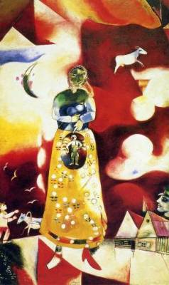 「母性」(1913年)畫的是一個懷了孩子的母親,夏卡爾參考了東正教聖像畫裡,「聖母子」主題的構圖傳統,但他常常把宗教神聖性的強調轉變成凡俗的,充滿家庭感的感覺。所以當他畫「母性」時,我們一看就知道這不是聖母瑪利亞,她穿的衣服是典型的猶太女子的衣服,尤其是頭巾最明顯,因此這就是一個懷孕的猶太女子。 慢慢的我們會在巴黎可以看到他常常不能忘情的幾個東西,他故鄉的房子,在天上飛的牛,還有鮮豔的色彩。