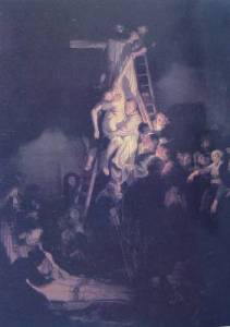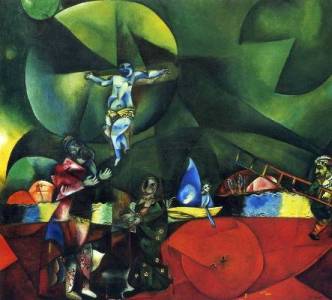 1912年的「受難」中,立體派的影響就更深了,他用了立體派的風格把一般畫耶穌釘十字架的東西完全拆解,完全分開。如果比較林布蘭特的「耶穌受難」,會看到畫面中有人拿著梯子把耶穌的屍體拿下來,馬利亞和其他的幾個門徒圍繞在底下,整個的構圖的人物是集中在一起的。基本上在西方繪畫傳統裡,若是畫耶穌被釘十字架,或著將耶穌從十字架上卸下的主題時,都是人物圍繞著十字架的這種構圖。但是夏卡爾卻把這些素材拆解開來,分成許多區塊,拿梯子的人在右邊,馬利亞和另外一個人在十字架底下,畫的方式是很典型的立體派切割的畫法。 不過夏卡爾和立體派最大的不同處在於一般立體派的畫可以看到很多靜物的主題,以對形式做研究,但夏卡爾不喜歡畫靜物,他喜歡故事。所以在很早期的時候,他就對基督教的素材感興趣。這在猶太圈子裡其實蠻不可思議的,對猶太人來說夏卡爾的這個企圖是非常非常衝破猶太人的傳統跟禁忌的。但是夏卡爾他自己似乎不太在乎,雖然他的同胞一直批評他,但是他到晚年的時候,尤其是當猶太人在歐洲一直被驅逐壓迫的時候,他就常常的描繪耶穌。