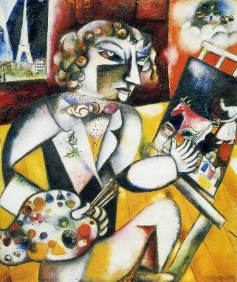 夏卡爾到了巴黎之後,整個畫風改變,用色變的鮮豔,想像力變的馳騁,構圖也變的大膽。在他的巴黎早期雖然他離開了自己的家鄉,但故鄉一直在他的腦海裡面,在1913年的「自畫像」裡,可以看到畫家後面的兩個風景:巴黎,和他的故鄉維台普斯克,他還用希伯來文寫了巴黎跟他故鄉的名字。在這裡很明顯的他的兩個重要的靈感泉源在他的畫裡出現。 更特別的是畫家的手指頭有七根。按照哈西德的傳統,有七個手指是有神助之力的人。(在猶太人的觀念,七是一個整數,因為上帝用了七天創造世界,所以七具有神性的涵意)。因此夏卡爾把他自己創作的泉源,創作的能力,創作的靈感跟神性連在一起。日後他甚至借用宗教題材偷天換日,將一個畫家受到靈感畫畫的時候,類比成就像馬利亞接受聖靈成孕的時候,接受天使的消息的一樣的感覺。