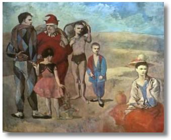 畢卡索開創立體派之前,也曾經繪畫苦難主題。他早期的藍色與粉紅色時期,貧窮人家與小丑世界,交織的在畫面上出現。畫家透過小丑世界陳述苦難,自有其深意。因為小丑的使命是讓人發笑的,而小丑自己一離開舞臺,卻是悲苦的。這就增加了小丑的心靈苦難。遠在貴族與中產階級交替的十八世紀初,畫家華鐸已透過小丑世界,在歌舞昇平中淡淡滲透著一抹哀歌。
