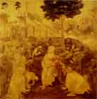 「賢士來朝」,原本是東方三博士隨一顆奇異的星的 引導,去朝拜耶穌的故事。傳統畫法都一定有馬廄。達文 西非但沒有畫出傳統的馬舍馬廄,反而出現宏偉的建築、 遼闊的原野與兵馬的騷動。光就這背景,達文西把三博士 朝聖「現代化」了,觀畫者將會很容易感受到,「賢士朝 聖」的故事是發生於此時此地,而不是遠古一千多年前的 歷史。