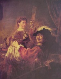 觀看一個畫家對同一個題材不同的表現,會有幾個面向的旨趣,它有可能讓我們看見畫家在技巧上的專研和突破,如莫內著名的睡蓮系列;它可能是畫家一生中不斷反覆的一個情境,透露了某種持續性的關切,如在卡拉瓦喬畫中不斷出現的斷頭情境;又或者畫家在經歷一段年歲之後,又重新將之當作繪畫的素材,此時一段長時間的跳躍,便能帶我們進一步思考一個藝術家心靈在時間脈絡下呈現的轉折。 林布蘭特對於聖經中「浪子」寓言的描繪,就能帶來這樣的觀看。 ![]() 第一幅其實是畫家大量自畫像的其中之一,林布蘭特的自畫像向來如日記般,以極多的數量成為觀察他一生蛻變的最佳文本。畫中他與新婚妻子一起,從滿是宴席的桌前回頭,他咧嘴而笑,摟著懷中嬌妻向觀者高高舉杯,邀請大家分享他的成就與快樂,光線將他們兩個自暗中烘托出來,畫家頭上豪華的羽毛帽子,細緻的首飾、衣服和配劍都閃著金色的光芒,整個室內充滿了輕鬆愉悅。這是畫家正值壯年、好大前程正開展的時刻,他自己將這幅畫又稱為浪子回頭,這裡回頭的浪子有一種略帶幽默的自喻和自得,努力有所收穫,情感得到滿足,在回頭並舉杯的這個動作裡,這個年輕人向大家頌讚著自己這個值得被享受的人生。
