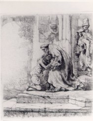 另外約在此同時期另一幅「浪子回頭」的版畫,則展現了他在技巧上的卓越細膩,父親與兒子在門外的平台上相遇擁抱,其他人聽到消息急忙推開窗、走下階梯觀看,台階造成視覺上強烈的情感流動,最後匯集在父子身上,讓人感受到相遇瞬間的激情。林布蘭特在這裡的精彩之處幾乎全在浪子身上,他特別仔細的處理了浪子經歷潦倒、流浪之後的滄桑感和見到父親時的懊悔激動,而父親的表情則相對的較為嚴肅呆板。在此之後有漫長三十年的歲月,畫家經歷起伏最大的人生大半。他從一個前途大好的青壯年人一路的為人夫,為人父,走到擁有事業、婚姻、家庭的人生顛峰,接著又迅速的走下坡,他的畫作因荷蘭社會流行風潮的轉變淘汰,不再受到歡迎,曾經累積的財富也很快的被不善理財的他揮霍殆盡,最終導致破產,緊接著摯愛的妻子、孩子又一個個的因病先他而去;晚年垂垂老矣的他孑然一身,債主比朋友還多,一如耗盡一切所有的浪子。 也正是這樣從人生境遇的從喧嘩到落寞,讓林布蘭特晚期的畫走向一個沈思般的內心世界,除了繪畫,他再無所可傾訴。他不再只是講一個充滿高低起伏的精彩故事,而是在簡約的畫面中,更個人而深入的談一些在人性幽微之處顯出意義的主題,諸如憐憫、慈愛、寬恕。於是三十年後晚期的「浪子回頭」,比之早期的兩幅作品,呈現了徹底的內斂,沒有炫耀,沒有激情。 晚年這幅「浪子回頭」宛若靜止,即使是旁觀者,都是以不同的角度在旁邊佇立、觀看,以各自獨特的角色意義,陷入對這個「相遇」的內心反應和思緒中。落魄的浪子如今背對著我們,跪在父親面前,表情隱約而充滿平靜,他被自父親而來的溫和光芒完全的覆蔽,平復了他破爛衣著所暗示的狼狽不堪,獲得了心靈上的安歇;白髮蒼蒼的父親面容有著經歷了年歲的謙和,他彎身低頭,在身體和心靈上堅定、無條件的擁抱失而復得的兒子。