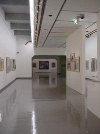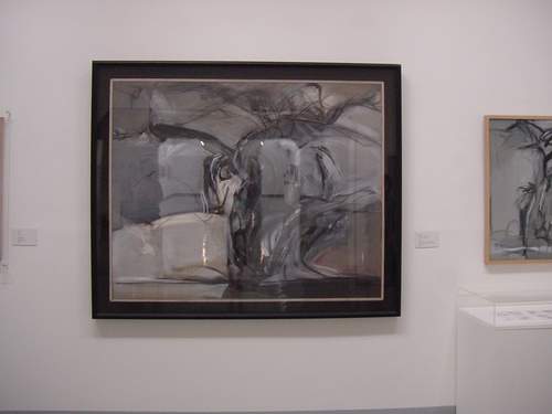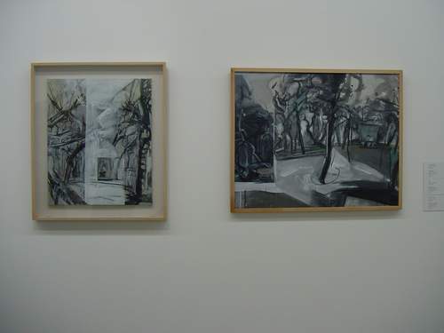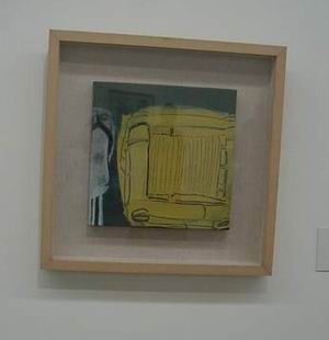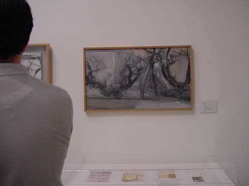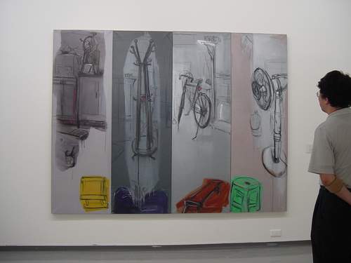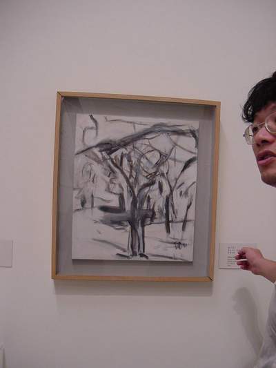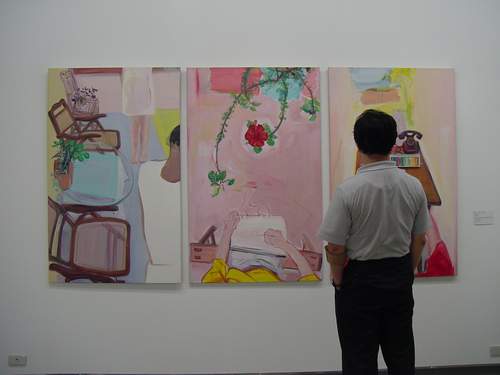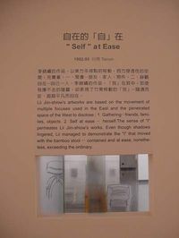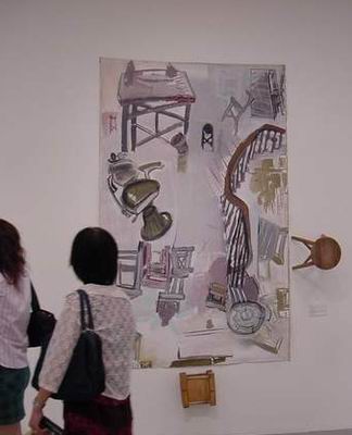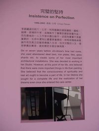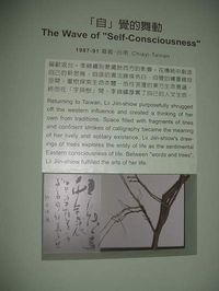 ![]() ![]() 她在巴黎時期仍舊有多幅自畫像,但她呈現出來的自我,儘管有巴黎時期的抽象形式,但那些自畫像卻呈現著完整自信、一點都不扭曲、甚至略帶幽默的風格,那是她所有繪畫時期,將自我表達的最飽滿的時期。 『自』覺的舞動 ![]() 王素峰為李錦繡返台後「『自』覺的舞動」製作的裝置藝術。 回到台灣後,李錦繡對空間的探索,從多度空間的真實與非真實,轉而變成一棵樹樹枝向上向外伸展,對空間產生的變化感。這種空間探索,類似畫家蒙特里安透過樹對宇宙的探索,只是,李錦繡放棄理性分析的西方精神,透過她精湛的書法藝術的筆觸,表現感性浪漫的生命力。李錦繡說,「每棵樹都像個字。」 李錦繡像畫一般的書法。 ![]() 李錦繡這幅畫,是透過繪出玻璃帷幕,產生多重空間,並在這些空間中繪出右側巨樹攀升向上,左側轟然崩裂癱倒的戲劇性效果。 ![]() 每棵樹都像個字。 ![]() 充滿感性浪漫的生命力。 ![]() 李錦繡「生命」 ![]() 1992年的《融》,我將之視為過渡到「竹板凳繪畫時期」(1992-95)的作品。畫面構圖切割為三,左側與右側,都是四處伸展、自由奔放、充滿生命力的樹枝,隱隱可看到濃密有力的樹枝後面,是有著門框的建築,畫面中央,建築被白色顏料塗去,(這種塗去法,在李錦繡後來的作品中,成為蠻重要的一種繪畫方法。)只剩下門框,門框內,一個女人坐在長凳上,五官難辨、面容模糊。 以下作品「融」置中,「融」的左側,是充滿生命力的樹下,畫家置身自然中作畫,「融」的右側,是充滿生命力的樹下,一對情侶款款深情的談心。左右這兩幅,更對襯出「融」這幅作品的過渡性,李錦繡即將把靜觀繪畫的對象,由大自然充滿生命力的樹,轉向室內觸目所及的物件。 ![]() ![]() 自在的自『在』 ![]() 王素峰的裝置藝術「自在的自『在』」。