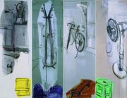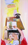 就是1992年,李錦繡繪畫風格再度轉變,我將之稱為「竹板凳繪畫時期」。這段時期,李錦繡以穿黃脫鞋的腳、和一張竹板凳,表達自我,而這種表達,是充滿高度的銓釋空間的。1992以後,李錦繡的繪畫作品風格再度轉變,樹的主題不見了,彷彿《融》這幅畫作最中央的門框內景,成為主要的觀看對象,室外那一切充滿生命力、爆發的樹枝,全消失無形。 1992年《進行中的自畫像》,是李錦繡在風格轉變時畫的自己,她畫自己正蹲在地上,處理尚未完稿的自畫像,因此畫中呈現兩個自我,其中一個,蹲在地上,畫面下方是張竹板凳,這個自我的面容依循她經常使用的肖像畫法,把臉擦塗過,模糊著五官,另一個自我,是在畫中的畫裡,輕輕淡淡的勾勒,彷彿褪進畫布中,即將隱形;饒有深意的是,畫中的畫布像個鎖住自畫像的閉鎖空間,甚至像個棺木。這幅畫具有很強的、對日後風格的暗示。 ![]() 李錦繡1992年後所畫的室內,仍舊是空間的探索,但所有的空間都充滿物件,是被佔滿的空間。黃海鳴研究李錦繡這時期的作品說:「在《有壺的圖像》這件作品中,錦繡一件件的將廚房中一切繁瑣的事物抹除,只剩下不完全的輪廓,唯一留下來的就是中央那把茶壺,這種更加人工化以及觀念化的行為,更能凸顯日常生活以及居家空間所給他的某種負擔。」(黃海鳴《李錦繡的在家「任遨遊」》) 李錦繡「書房一隅」1992(右) ![]() 李錦繡「風雲際會」1993 ![]() 當我看她所繪的《觸目所及》1993,各種各樣的家庭物件中,隱著小小一張竹凳,以及她穿著拖鞋的一隻腳,無法不讓人感覺,她被家庭需要淹沒到只剩下竹凳與雙腳,企圖吶喊些什麼。 李錦繡「觸目所及」 ![]() 這時期仍舊是空間探索與自我表達的雙重唱,隨著觀看家居空間被生活種種必須物件、與藝術收藏佔滿,變得凌亂不堪,李錦繡的自我表達,也出現她最著名也最重要的,代表自我的竹板凳、與雙腳。這時期她出現於畫中,總是家居空間角落自己的一雙腿與腳丫子,她的臉與上身是完全在畫框外不被看見的,要不,就是她常坐著的竹板凳,她用竹板凳代表自己,無言的盤據充滿物件的凌亂房間的一角。 ![]() ![]() ![]() 黃步青提到和李錦繡論及婚嫁時,席德進老師曾表示不贊成,原因是,他對李錦繡的創作才華非常肯定,他曾在李錦繡班上當眾說:「你們班上只有一個畫家,就是李錦繡。」因此,他對李錦繡與黃步青是冀予一樣的厚望,而婚姻,勢必導致其中一人得犧牲,當然最有可能是女人,席老師出於關切,十分不忍心。當時,黃步青當場允諾,他會一輩子支持錦繡的創作,席老師方才肯參加他倆的婚禮。 可是日後跟李錦繡一齊受教李仲生門下的藝友程武昌說:「李錦繡相當有才氣,不知為何在藝術活動上少下功夫,也許我們的時代是男女有別,藝術創作這件事也大都重男輕女。」 王素峰在《竹凳移動去——看李錦繡的藝術》一文中談到李錦繡的竹板凳時期也說:「熟識李錦繡的人都說她成天料理家務(買菜、料理三餐、洗衣、拖地....),兼課、教兒童畫,還得幫黃步青作裝置藝術,可以說裡外忙得團團轉。」 李錦繡的先生因為從事裝置藝術,因此很喜歡從外頭撿一大堆可能可以被使用的物件回來,堆滿了家中所有的空間,在這時期,李錦繡甚至沒有專屬於自己、可以讓自己安靜思考作畫的空間,直到過世前三年才在外面有了自己的「李錦繡工作室」。 有兩幅畫,暗示這樣的生活中,李錦繡與丈夫之間的關係。這兩幅畫都很有意圖的在透過作品說話。 李錦繡「居家」1992 ![]() 另一幅《觀自在之三》(我和....?1995),看了也是讓人有不可言喻的複雜心境,畫中是她的雙腿雙腳,對面是另一人的雙腿,兩人都沒有出現上半身與臉。對面那人顯然是丈夫黃步青,但只有雙腿雙腳的對坐,特別呈現出一種不該有的距離與沈默。 ![]() 被空間佔滿後的雙腳與竹凳,沒有上半身的自我,無法不叫人感覺,李錦繡充滿透過繪畫反應她這時期感受到的、自我的缺席。 自我缺席的竹板凳時期,於2002年告終。 完璧的堅持 ![]() 王素峰為李錦繡生命最後時期創作的裝置藝術。 2002年,李錦繡以油蠟筆畫了一幅自畫像,她舒適的坐在有靠背的大椅子上,雙腳翹在另一張椅子上,雖然臉上一貫以色彩塗抹弄得有些模糊,但仍看得出臉上的自信神采,畫面最下方,出現一雙她竹板凳時期的腳丫子,被畫於靠著椅子的黑板上,彷彿是以在現完整的自我,省思過去那上半身不曾露面的竹板凳時期。 就是在這一年,李錦繡發現自己罹患癌症末期。 ![]() 2002年,李錦繡的繪畫,色彩出現了非常大的變化,2002年所繪的《容和、相待、彩虹曲》,一看畫就覺得那真的是另一個不同於之前家居的世界,色調不僅柔和、而且用了非常多亮麗的暖色,顏色協調互補,沒有任何衝突感,空間也不再被物件擠滿,整齊、潔淨、清爽,還出現綠色盆哉。在這幅畫中,仍只出現她的下半身,但兩隻腳,已非常明顯的伸進畫面至少三分之一的空間,此外,還出現了雙手,雙手正在悠閒的作畫。整幅畫呈現的色彩、空間與悠閒作畫的雙手、舒適伸展的雙腳,都讓人分外感覺這幅畫已表達了,李錦繡期待的空間感與自我感,都讓她十分的滿意。 唯有左側《容和》在溫柔亮麗的色彩中,可以看見一男一女仍維持著不對話的疏離關係,這意味了,透過色彩表達出來的心境轉變,應當跟已然疏離惡化的夫妻互動沒有關係,李錦繡心境轉變,應另有原因。 ![]() ![]() 《容和、相待
