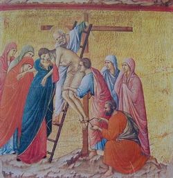 文藝復興早期的西納地區的畫家杜契爾(Duccio 1260-1319)所畫的「卸下十字架」,正是永不衰殘的聖母的典型代表。