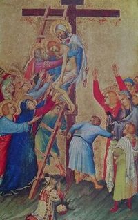 馬提尼:「卸下十字架」 另一個對照作品也出自西那地區,是跟杜契爾同時代的畫家馬提尼(Martini 1284-1344)。馬提尼跟杜契爾一樣,繪了受難、聖母悼子,但馬提尼擅長用更複雜的線條節奏、充滿張力緊繃的均衡、以及參與群眾的誇張手勢,來表現激動的情感。
