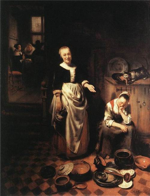 〈沈睡的女子〉(左圖)也是維梅爾早期的作品。你可以發現背景和前景有很大的差別。前景東西擺得非常混亂,背景很乾淨,沒有任何的東西。這樣的安排可能借用當時風俗畫的題材。 對比同時期的另一幅畫作(右圖),畫中女孩的姿勢都相同,但這幅畫說教意味就非常濃厚。背景有一群客人,前景則是一位婦人指責女孩的懶惰,鍋碗瓢盆擺著不洗,東西都被貓偷吃了,她卻在睡覺。這是一幅要人勤勞勸勉性的畫,正是荷蘭風俗畫喜歡在普通的生活題材中,加些教訓的意味在裡面。兩張畫的基本結構非常相像,分前景和背景,但是一張背景有人,一張背景是空的。後來的人用X光照射的技術,發現維梅爾在背景曾畫了一個男人和一隻狗,狗代表忠心勤勞,剛好暗指前景的女人非常懶惰,男人則代表都已經有人了,女人還在睡覺,更加顯得懶惰。但是,後來維梅爾決定把男人和狗塗掉。 用這兩張畫的對照,我們可以看到維梅爾生長在法蘭德斯的傳統,卻把責備的人物去掉了,把構圖單純化,把懶惰的意思沖淡了很多。雖然原本畫的內容和人物的姿勢,是取材自原本當時傳達懶惰的畫,維梅爾卻刻意沖淡這種說教的成分,脫離說教的傳統,不希望有太多象徵的意義在他的畫裡。 如果看塔森出版的維梅爾畫集,他是採取另一個路徑,認為維梅爾的畫裡有很多濃厚象徵的意思。但是我個人覺得,維梅爾寧可他的畫中不要有太多其他的象徵,寧願他的畫欲言又止,寧願他的畫說了一半就停在那裡,像中國山水的留白空間。他的畫留白空間非常的大,他不希望在講一個故事。雖然我們很希望知道這個女的在做什麼,那個讀信的女孩背後有什麼故事,但是維梅爾本身並沒有要講那麼多的故事。他就是捕捉剎那後,讓剎那凍結在那裡,他不讓故事延續下去,因此把男人和狗去掉,單純留下一個在睡覺的女孩。另外,也有人認為在西方繪畫裡面,這個女孩的姿勢是代表憂鬱,所以,這幅畫也有可能只是畫一個心情不好的女生。而水果、美麗的毯子、白色的酒瓶、獅子頭的椅子,這些東西在他之後的畫,一直重複出現。 |