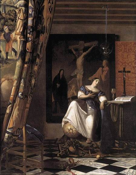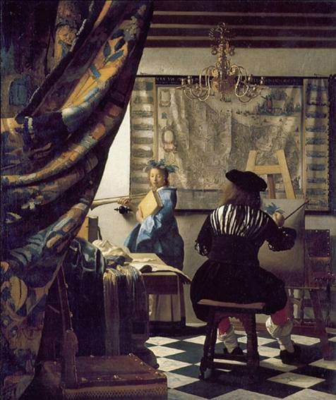 〈繪畫的寓言〉是在歌頌藝術的偉大。我個人認為畫中的畫家就是維梅爾自己。和在老鴇中側面回頭對著讀者笑的那個人一樣,具有相同的頭髮和衣服,但在這幅畫,畫家不肯讓我們看他,他背對著我們在做畫。畫中的女主角是從書上抄來的,因為這個女孩子頭上戴著桂冠,手上拿著書和喇叭,象徵Clio,歷史的守護神。桌上有個面具,是要說明藝術是用來模擬人生的。牆上的地圖也是畫的非常精緻。這張不是非常明顯,但是從暗箱輔助器材來看,光線是有改變的。在藝術史的討論中,重點其實不是要去問有沒有用暗箱來作畫,而是假使有,呈現出來的光線是怎麼樣子的。