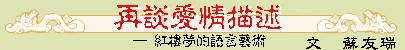 在紅樓夢描述愛情關係的語言藝術中,不但表現出人物描述的藝術水準,更促使了解各種人性的虛實與文化限制的困境,這是我這篇文章嘗試表達的。我主要談論的是第三十四回『情中情因情感妹妹 錯裡錯以錯勸哥哥』裡的情節,與第二十五回『魘魔法姐弟逢五鬼 紅樓夢通靈遇雙真』裡的一小段。