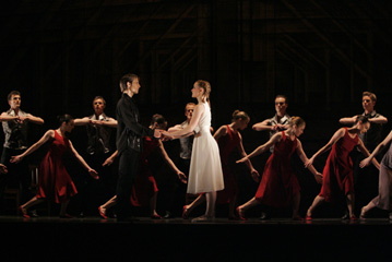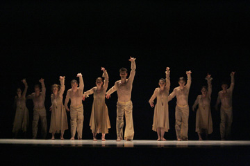 這一場算是三場中比較有劇情的,主要是在講在一個鄉村的婚禮,新郎新娘兩家人之間的混亂和衝突,面對孩子結婚會有的心裡掙扎和不捨。當幕一拉起時,舞者開始排椅子,排好後分成兩邊坐下,左邊是新郎、新郎的父母與男性的賓客,右邊則是新娘、新娘的父母和女性的賓客,一開始是兩邊分別的舞蹈,這時候讓我覺得,果然,結婚真的不是兩個人的事情,是兩家人的事情阿!中間也交雜了新郎與新娘分別與自己和對方父母的互動,兩家父母彼此的交談,當然少不了的是賓客壯觀的群舞。而在一片混亂後,所有的人為這對新人獻上祝福,除了新郎與新娘外的舞者躺在地上成一長列,就像是進入教堂的紅地毯,讓新人從上面走過。