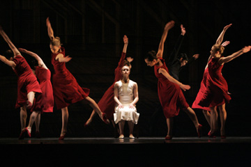 之前我在網站上注意到他們邀請了一位中國的打擊樂音樂家Yim Hok-Man(閻學敏),想必他們使用的音樂應該帶有一些些國樂的成分或影響。不過當音樂響起,真是出乎我意料之外,整體的音樂都是很中國的,一開始沒有任何的旋律,完全是用鼓的節奏和聲響來作為伴奏,舞者隨著鼓聲起舞,我不曾想過芭蕾可以這樣表現,一開始比較像是鼓陣,接下來越來越豐富,像是京劇的鑼鼓段子,一聽就像是有個大花臉或是什麼角色會走出來那樣,不過眼睛所能看到的就是芭蕾,也許對外國人來說是新奇,但是對我來說是一種衝突,因為當你很熟悉於某些文化,聽到某一種音樂,心中自然浮現出某個影像,但是眼睛看到的卻是完全不同的文化組合在一起,會有一種腦筋打架的感覺。最後更加入了琵琶、揚琴、胡琴、笛等國樂器,大概已經是一個國樂團的編制了。(其中有的獨舞也有樂器的獨奏)