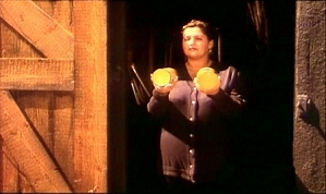 在這個農村狹小的家中,凱蒂最重要的地盤是臥房與廚房,這兩個空間,是她維繫自己主導權之處,凱蒂自己很胖,她對廚房煮食,又特別有強烈的掌控性。布蘭德除了外邊農地,回到家中,處處都是凱蒂的權勢,有時,他就會藉故把自己關進廁所,從廁所的縫隙往家中偷窺,這是他僅剩的地盤。或者,他會到倉庫把玩木雕小矮人,好像他自己就是個永遠長不高的小矮人似的,甚至會用剁掉小矮人的頭的激烈動作,來處理自己的壓抑情緒。