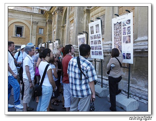 這個廣場邊豎立一整排的西斯汀壁畫圖解,因為進西斯汀不能解說,因此所有導遊都得在此講解完畢