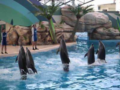 後來到了鯊魚館去繞繞,有冷氣感覺也消暑多了,另外有一個窗戶還能看到可愛的海豚游來游去,一直繞圈圈玩,真可愛耶!有了海獅的經驗,我跟海寶藍想想其他的也都不想去了,乾脆一個半小時前就坐在海豚的表演場裡面等,免得沒有位置,中間我去了洗手間,隊伍也是長的不得了阿!更恐怖的是,一群阿媽等的沒耐心,看男生廁所比較沒人排隊(因為男生上廁所比較快吧!),結果居然就給他破門而入直接進去上,我看到跑出來嚇到的男生的神情,覺得頭上真是三條線阿!上完廁所想買個飲料,隊伍也是長的不得了,跟一個排隊的伯母聊天,他跟我說,他本來排一隊,是賣炒米粉和魚丸湯,結果他排了快半小時,賣到他前一個人米粉居然剛好賣完了,天氣太熱他又不想喝魚丸湯,只好重新排起,結果排了三十分鐘我也還沒買到任何一杯飲料,不過進去的人已經很多了,連走道都開始坐人,我怕我再不進去,就進不去之前坐的座位了,只好趕快一路擠進去。還好我的想法沒錯,因為再過幾分鐘整場開始爆滿,一點路也走不得,大概過了半個小時之後終於可以看到海豚表演了。