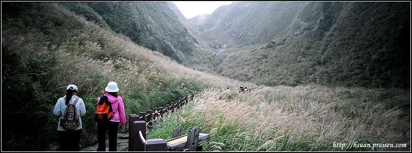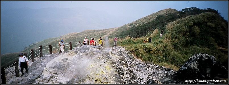 一下公車馬上吹來刺骨的寒風,讓怕冷的我連忙穿上外套,本來還想天氣很炎熱,應該穿件薄長袖即可,還好臨走前還是多拿了一件外套,不然這強勁又寒冷的風都快把我給吹跑了呢!拍了出發前的「使用前」合照,一行人就開始上山。大概太久沒有爬山了,之前又太累沒調養好,一剛開始上山我就走得很辛苦,另外小油坑的空氣中有濃濃的硫磺味,對於有氣喘的我來說呼吸起來是不太舒服的,不過還是不忘走在隊伍的最後方慢慢拍照。好不容易到了大家休息的地方,才聽到有人已經通風報信說我已經快要爬不上去了,真是不好意思。經過休息的第一站後,我慢慢找回自己爬山的速度,走起來就順暢許多。
