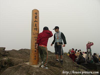 走了許久,終於看到前面一群人在休息,原來已經到了山頂,只是從另外一個方向上來所以我認不得,還多了一隻木樁,寫著「七星山主峰1120M台北市第一高峰」,這時候山頂一片白霧,因此無法體會「登七星而小台北」的感覺。休息一陣子之後,我們又繼續往七星東峰出發。