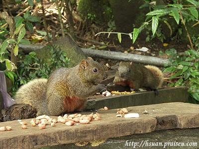 中午時分,走到七星公園,總算可以讓腿歇一歇,開始吃中飯。但是涼亭裡面卻一直出現可愛的赤腹松鼠,可以近距離的觀賞,讓我無法好好休息,貪心的拍了好多照片,而且可以很清楚的看見肚子的部分真的是紅紅的,只是餵食野生動物,會改變他們覓食的習慣,我總覺得不妥,只是也很難去阻止其他遊客。吃完飯後,大家圍成一團分享今天的心得,最怕自我介紹的我也沒辦法一定要去介紹自己一下。因為剛好旁邊有一大叢大花咸豐草,分享的當中我很不專心的跑去拍了好幾次蝴蝶,還好沒被領隊敲頭。