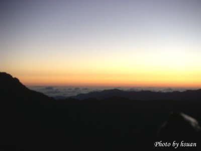 不管睡的如何,山還是要爬,早餐吃的飽飽的儲備體力,在山莊口整隊出發,此時天還是黑的,看的到很多星星,但路是一片漆黑,只靠著頭燈照亮前面的路,在黑暗的時候趕路,因為看不太清楚景色的變換,只能一路跟著前面的人的腳步走,雖然有點疲倦,但是身體卻是很自動的不斷往前走,而且因為是趕早黑,所以漸漸的,天色也開始明亮起來,氣溫也開始升高,整個天空的顏色也漸漸不同了,感覺上是踏上一條希望之路,越走越光明,到了哭坡前的瞭望台,也就是我們預定要看日出的地方,天已經差不多亮了,但是因為有雲遮住,無法看到日出,但是整個雲和天空的顏色非常的美,大家也在這邊拍拍照,休息一陣子。