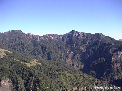 吃完了早餐,收拾好了行李,準備下山去了,但是因為前一天運動過度,所以我的腿已經是名符其實的「鐵腿」,要走七公里的路下山,其實我心裡也有數了。一開始我跟之前不一樣,走在前面的隊伍,為的是如果腿太痛休息,還可以慢慢的退到隊伍後面,一早是個大好的天氣,連嚮導都說他今年來過的幾次,都沒有像這一天這麼棒,整個天空都是湛藍的,沒有什麼雲,走著走著熱了起來,回頭看看住過的三六九山莊,遙望昨天待了很久的黑森林,含淚爬上的雪山主峰,走在陵線上,左右都是雪霸的山脈,左邊的品田山山頂非常的性格,是很漂亮的摺曲,而且看起來是很堅硬的岩石,想必攻頂是非常不容易的吧!走在人群中跟走在隊伍的後面感覺真的不太一樣,比較容易會走走停停,一大群走,比較不能給自己較長的休息時間,所有的停下休息的時間是嚮導控制,不過這樣的好處是休息的時間其實控制的很緊,所以路程上也比較不會耽誤。