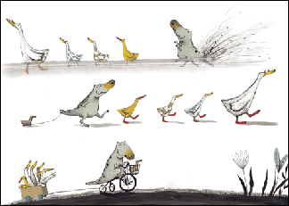 當三隻大鱷魚命令Guji Guji把牠的鴨子家人帶去橋上玩跳水,牠們好在橋下張開