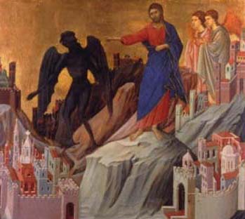 撒旦的試探正像當年在伊甸園,是圍繞在人與神關係的挑撥上; 耶穌是神的兒 子,但他卻以人的身份,在此受試探,正像當年的亞當夏娃。