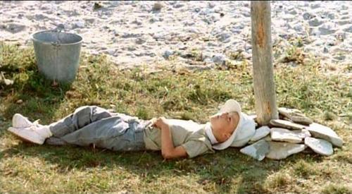 所以在「鄉愁」中,當多明尼哥要求全世界懺悔並自焚時(這時配樂是貝多芬的『快樂頌』,充滿諷喻),身為詩人藝術家的哥查可夫正謙卑的拿著燭火,一次又一次企圖不讓燭火熄滅的,走過一個泥濘多水的水池。而走過泥濘水池的鏡頭,在塔可夫斯基的電影中一直隱含滌淨心靈、贖罪的意涵。