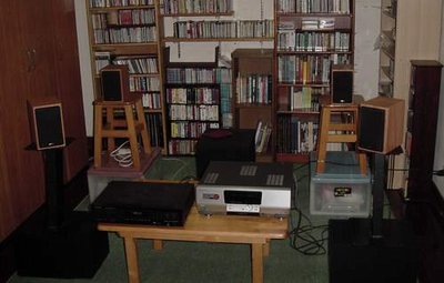 這面這張照片展現我第一次調整音響系統的成果,使用的是上一篇文章談到的『三萬元音響』。其中喇叭有兩對,一對是讓音響玩家來調整而得到的擺位,是後面近乎貼牆的擺位。之所以如此,是因為 ORTOFON 105 實在太小而超低頻不足,貼牆可以增加高中低頻的音質平衡,結果音場變成前述的『所有的樂器被壓扁在同一個深度空間,而沒有『深度層層分明』的效果』。優點是放什麼唱片都很順耳,缺點就是完全失去唱片的鑑聽力,什麼錄音方式聽起來都差不多。對於希望音響可以增進音樂欣賞能力的我們,這是完全錯誤的擺位。當然了,如果音樂只是當成背景的輕鬆聲音,這種擺位也算不錯。