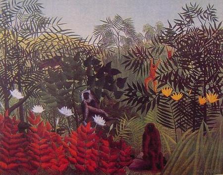 在他的畫中充滿了非洲叢林的風情,他也老愛吹牛他曾經去非洲冒險過,但其實他所有的非洲叢林畫作,只是他對異國風情的想像。盧梭的天性中有孩子與成人的混和特性,他對社會標準經常茫然無知。他異想天開辦了「教授詩、音樂、繪畫與聲樂」的小學校,但入學者無人成名;他可以拍拍肩對畢卡索說:「我們是全天下最偉大的兩個畫家,你是埃及風格,我是現代風格。」並自評自己1890的自畫像是「肖像風景的創造者」;他天真的臭屁屢被人譏諷,但他仍舊對自己自信滿滿、活得開開心心。