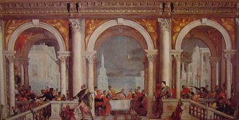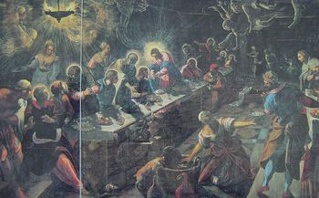 同樣都是人間世進入畫內,但丁多列托的畫充滿宗教性,維若內些卻不是,原因是,維若內些將貴族豪華宴會的描述,清晰一如畫面中央的最後晚餐,甚至畫面前方的貴族(應當是捐畫者),比例特別的大特別的明顯,相反地,丁多列托讓人物籠罩在陰影之中,隱隱約約難以分辨,他們統統被氣氛所挾裹,他們不是以獨立的個體身份發生作用,而是他們相加而成的整體才是意義所在,可視為勢不可當的宗教體驗。