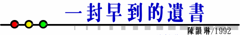 爸爸媽媽與正宏乾爹協議好了之後,媽媽便想到該寫封信給你。當然人家看到這封信,一定會說它是封遺書,一封早到的遺書。