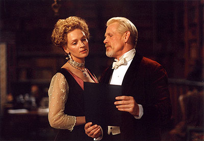 片名:金缽(The Golden Bowl)2000 導演:James Ivory 演員:Kate Beckinsale James Fox Uma Thurman Jeremy Northam Nick Nolte Anjelica Huston 愛默雷哥是義大利沒落貴族的後裔,他傳承了一幢充滿歷史的古舊豪宅,豪宅中房間多到搞不清楚是用來作什麼的,愛默雷哥的叔叔說:「把什麼房間都搞太清楚就沒有意思了。」而它的古舊是到了屋頂上的金箔不時落下,甚至會掉進正在被飲用的咖啡杯中,讓人中毒。除了這幢豪宅和貴族世家種種歷史傳說,愛默雷哥其實很貧窮,因此在一個古道熱腸的女人芬妮介紹之下,愛默雷哥認識了美國百萬首富、藝術收藏家亞當•維佛,並和他女兒定親,婚後預備和他們一齊住在英國。維佛答應出錢幫他整些這幢充滿歷史傳說的豪宅。 但這大大傷害了深愛愛默雷哥的女友夏綠蒂。夏綠蒂聰明、美麗,但比愛默雷哥還貧窮。打從一開始,愛默雷哥對他這樁婚姻的考量,就是現實成分居多。可是夏綠蒂還是很愛他。 一樁巧妙安排下的完美婚姻