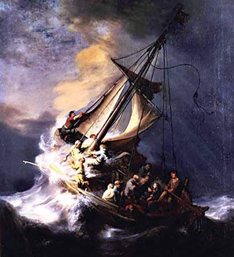 這一天夜裡也是這樣。當耶穌在山上禱告完畢的時候,已經是四更天(在清晨三時至六時)。那時門徒的船離岸在海中,海面上狂風大作,船被浪搖撼打著。門徒從船上遠遠的看著,居然看到有一個人在水面上行走,而且是往他們那裡的方向去。如果你在小船上你會有什麼反應呢? (圖二 加利利海上的基督 Christ at the Sea of Galilee)